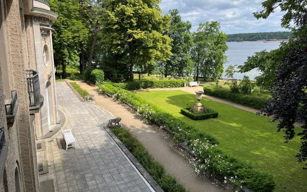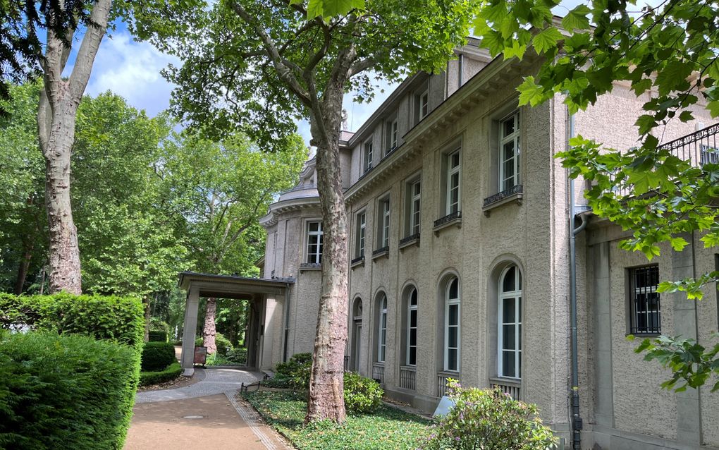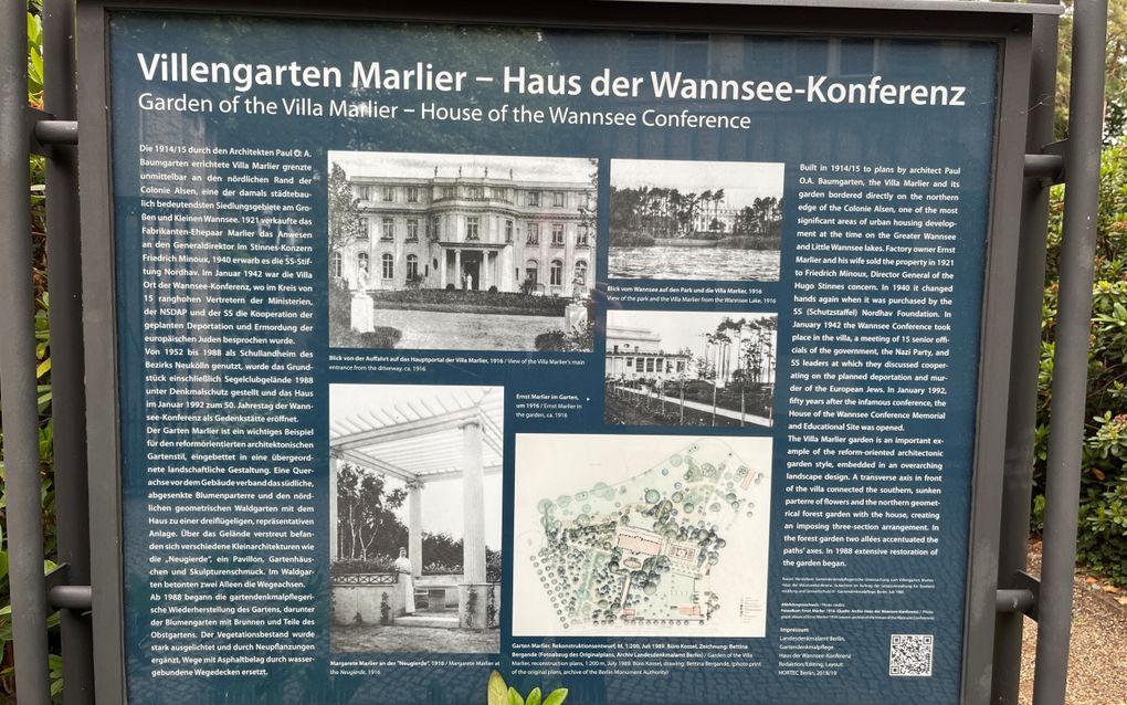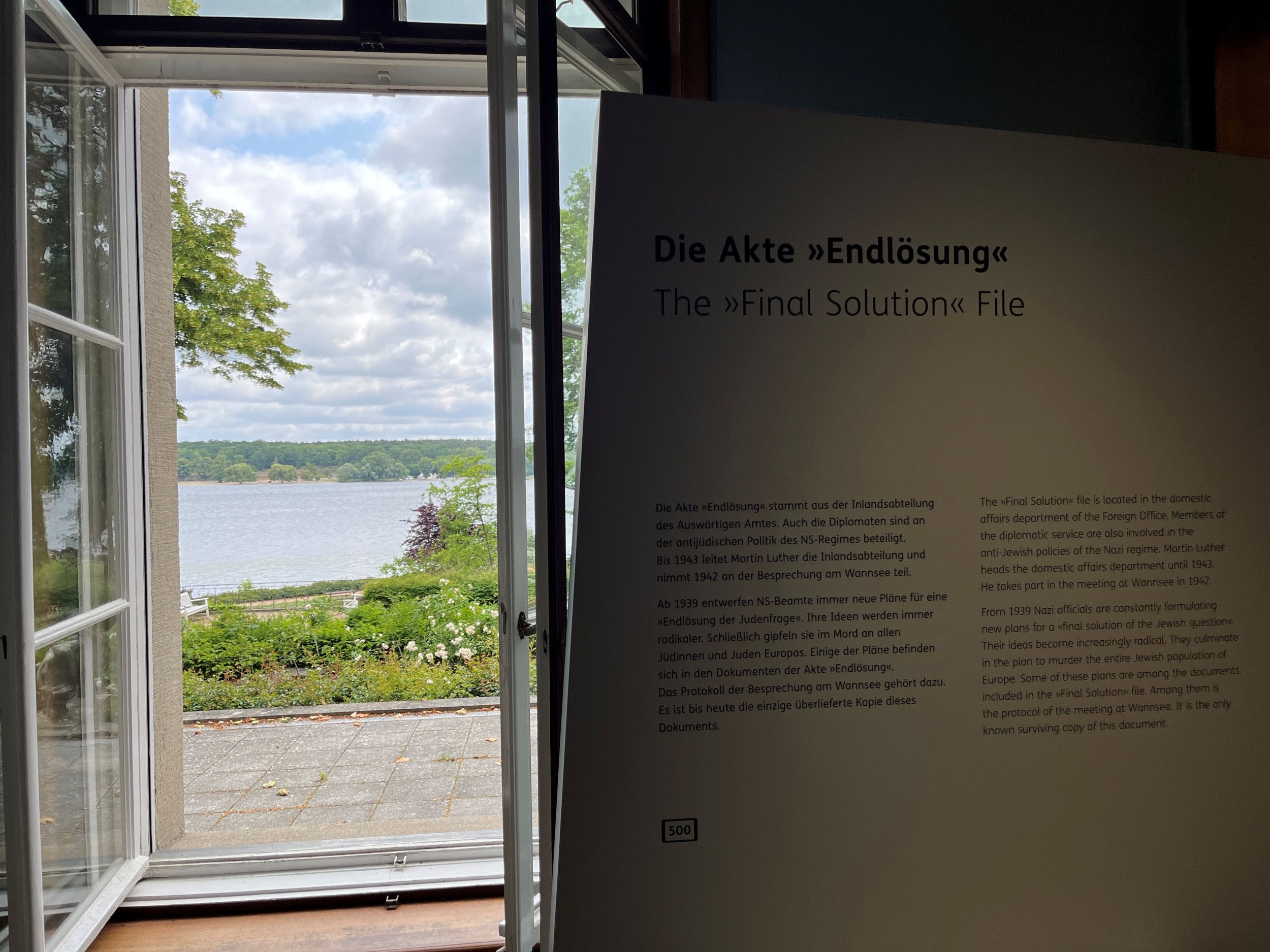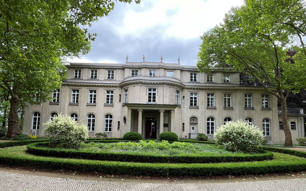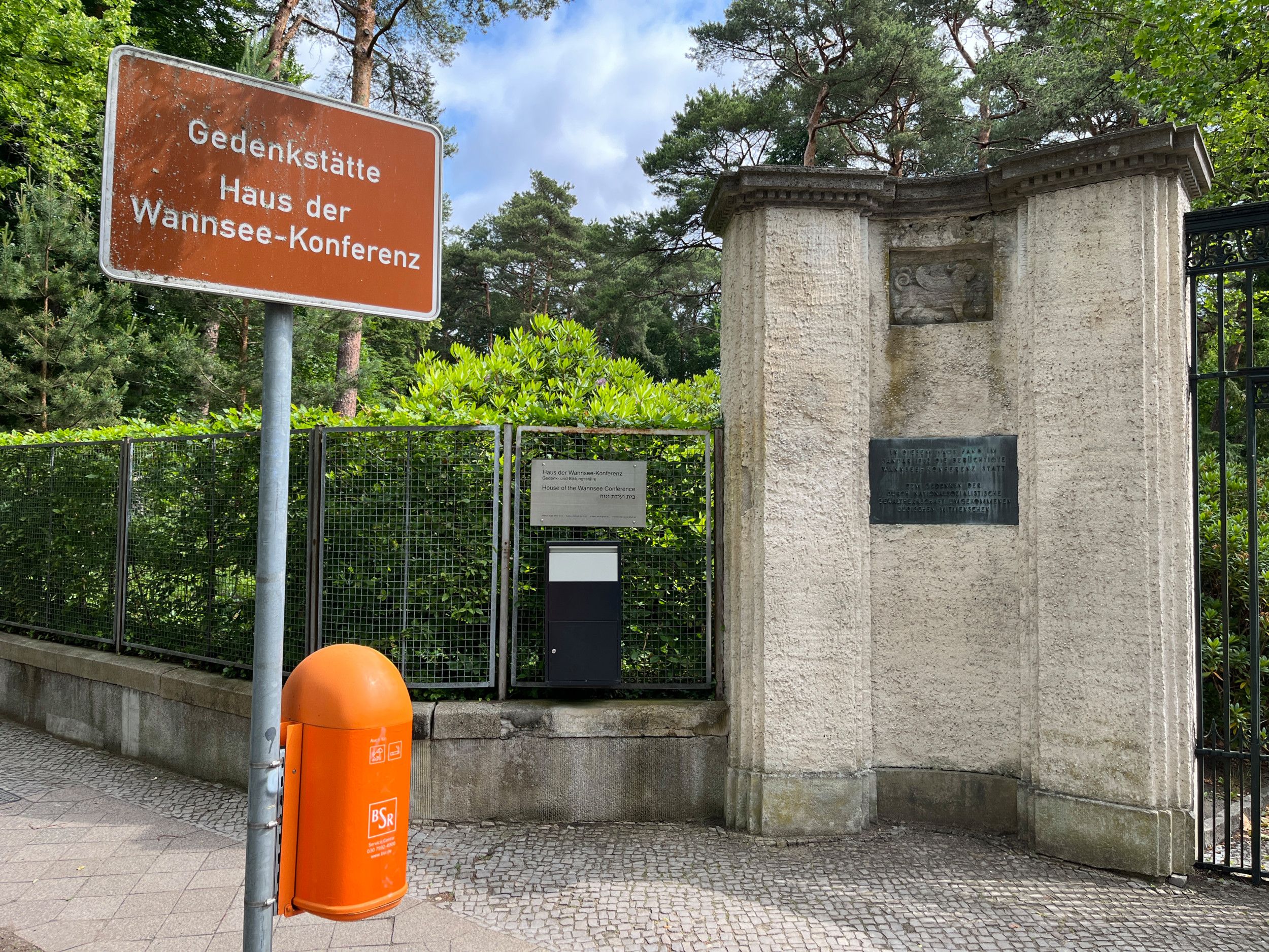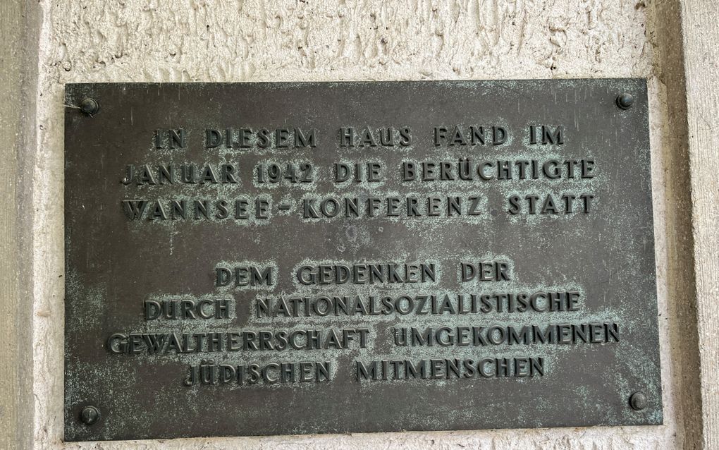 „In dit huis vond in januari 1942 de beruchte Wannsseeconferentie plaats”, staat op een bordje bij de toegangspoort. De waanzinconferentie. ”Ter gedachtenis aan de door nationaalsocialistische tirannie omgekomen Joodse medemensen.”