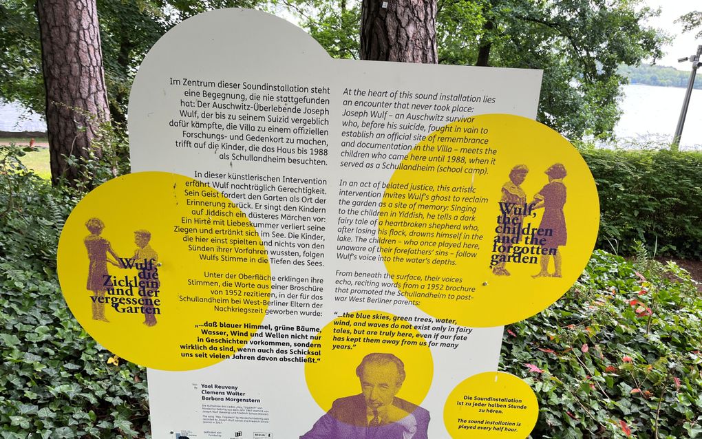 Buiten, in het bos, klinkt geluid uit boxen die aan bomen zijn bevestigd. Het betreft een fictieve ontmoeting tussen Joseph Wulf en kinderen die in dit gebouw kwamen als ze op schoolkamp waren.