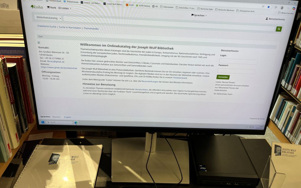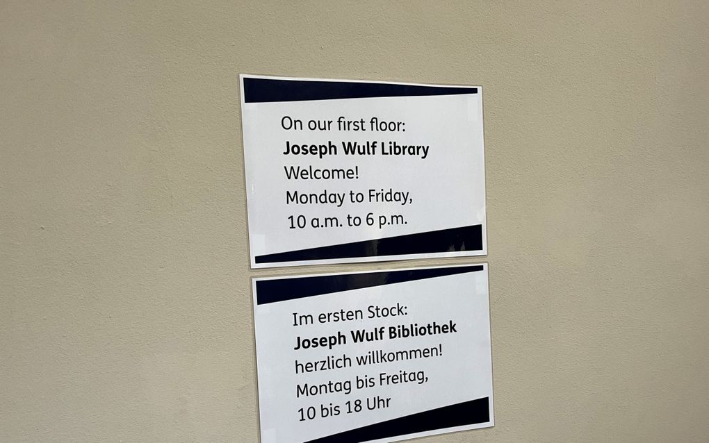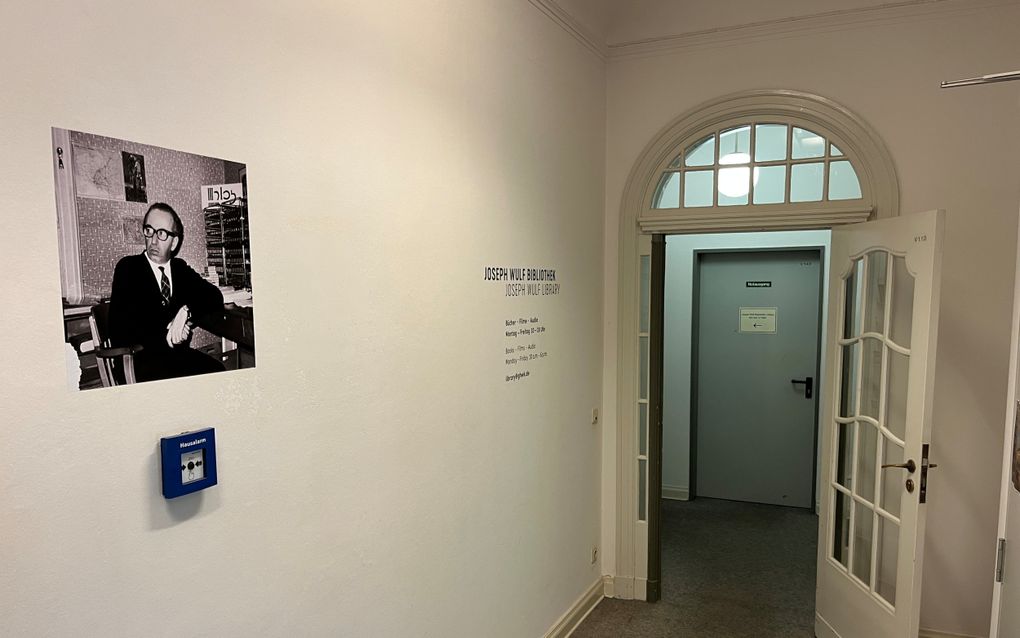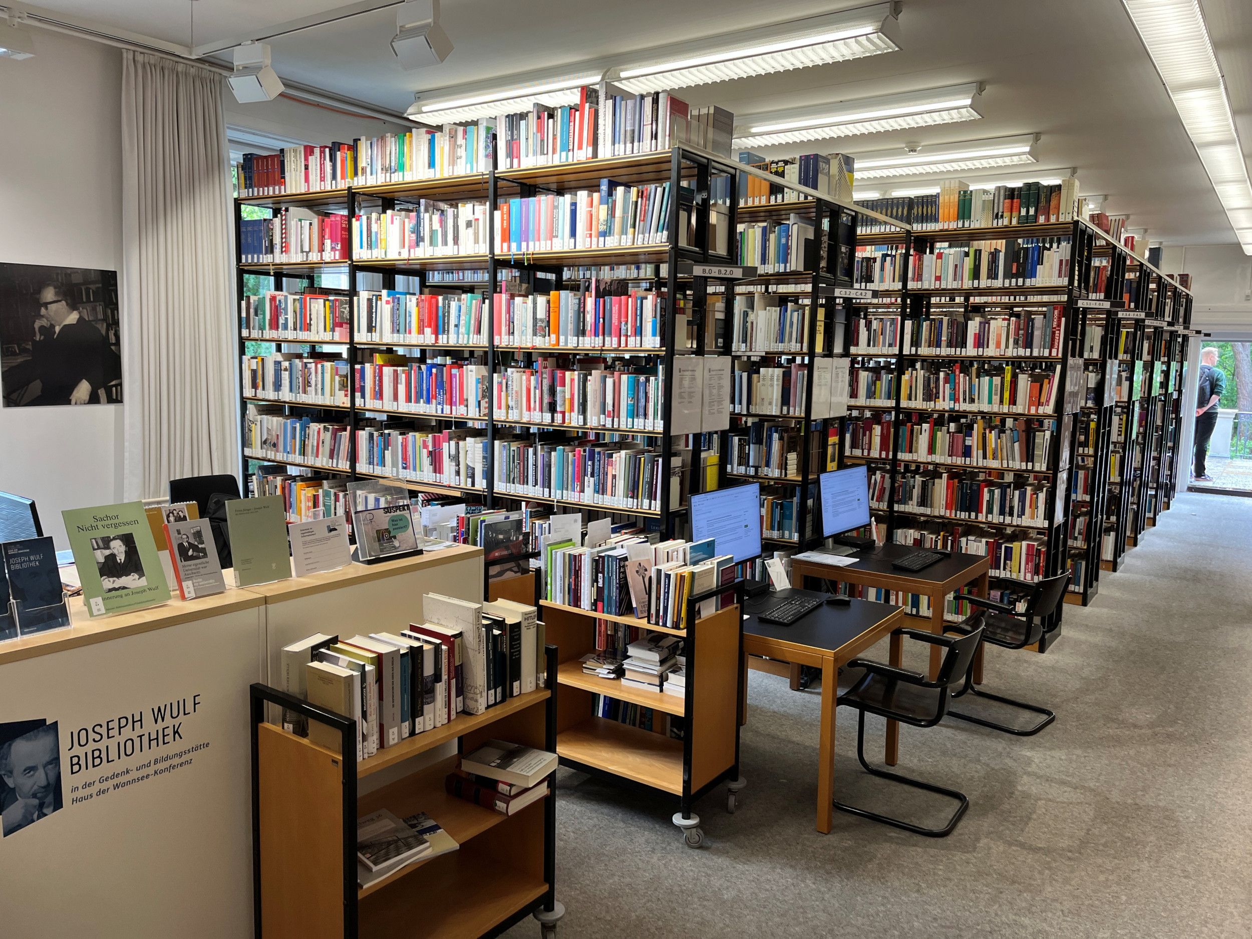 Op de bovenverdieping van de villa is de Joseph Wulfbibliotheek ondergebracht: 65.000 boeken, 10.000 films, talloze tijdschriften en documenten. Stelling na stelling vol doorwrochte werken over het Europese Jodendom, rechts-extremisme, antisemitisme, het nazitijdperk en de Holocaust. De gangetjes zijn smal, de stellingen hoog. Wat is er veel geschreven over die periode vol duisternis. En wat heeft de mensheid ervan geleerd, of niet.