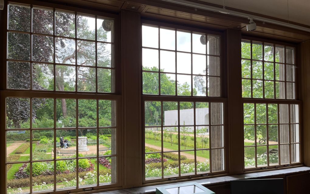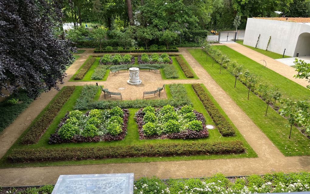 Opzij van de villa is een rozentuin. Daarnaast staat een vergadergebouw. En daarnaast een cafetaria, voor mensen die even moeten bijkomen.