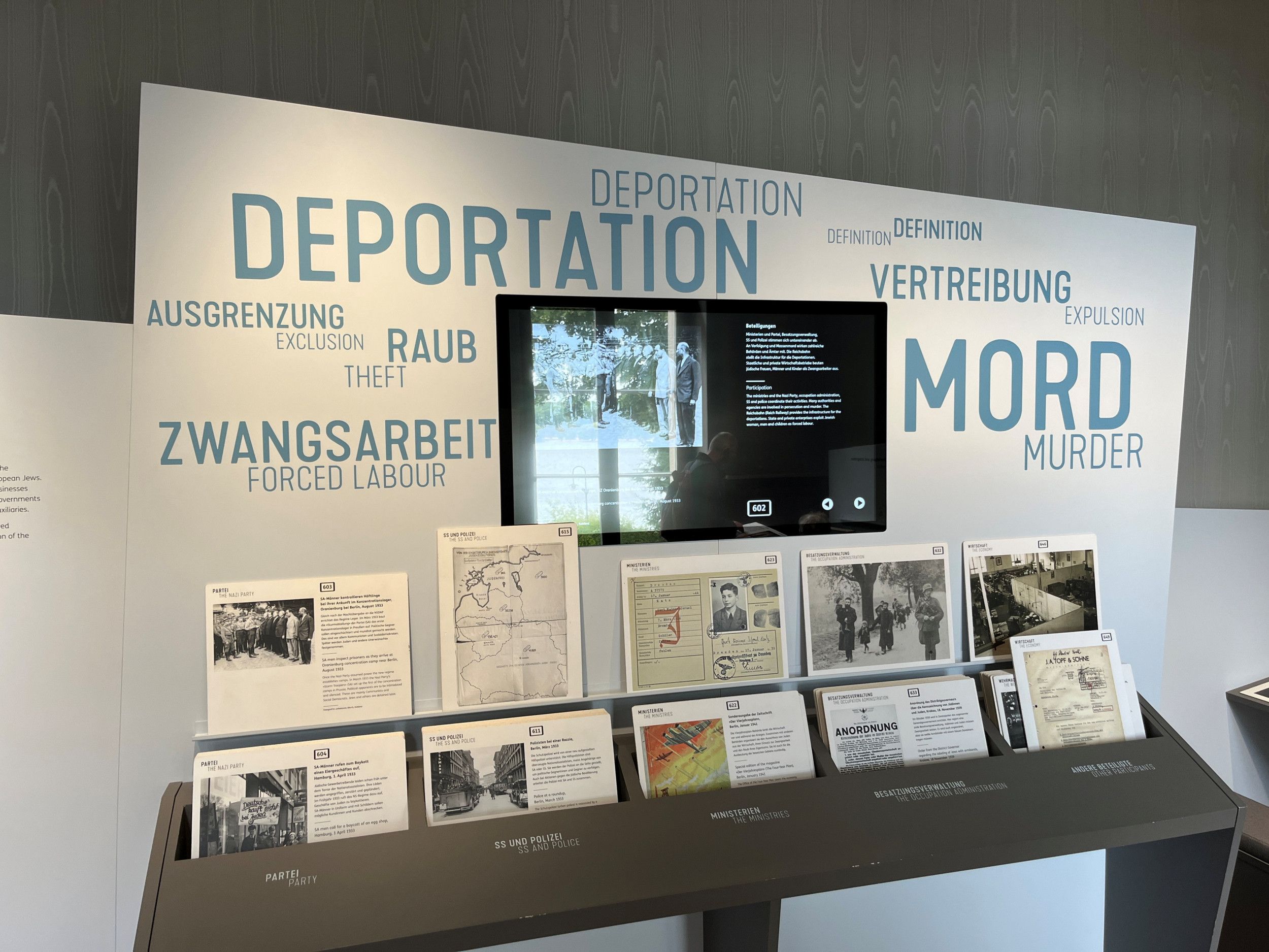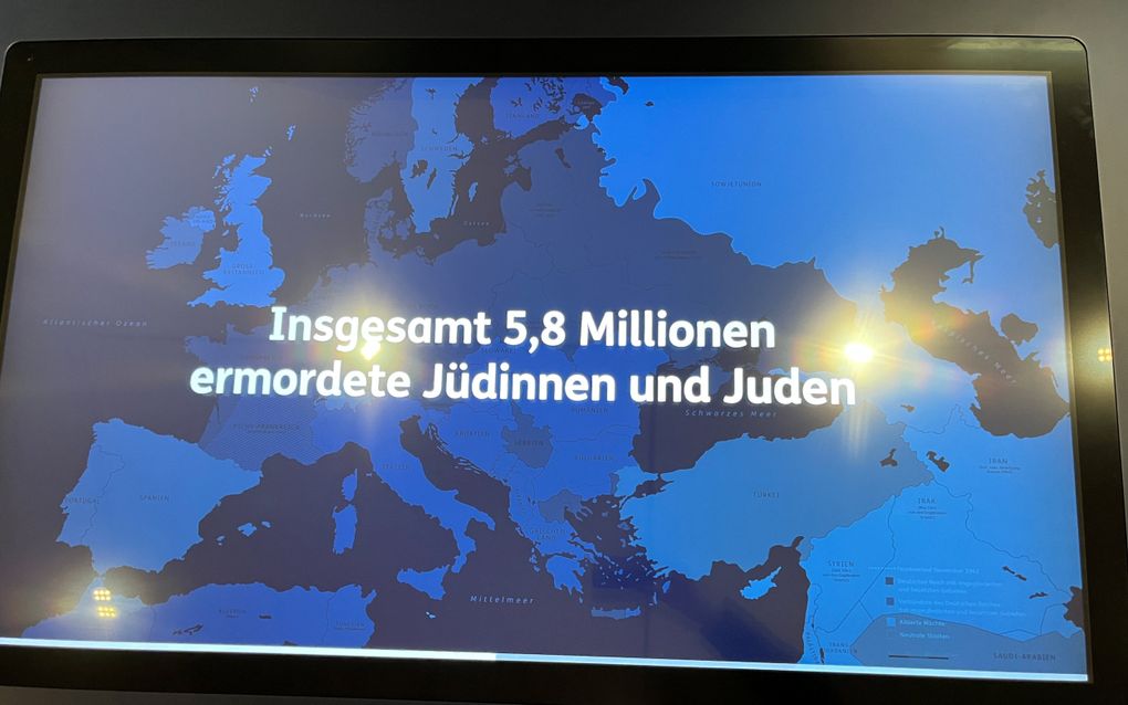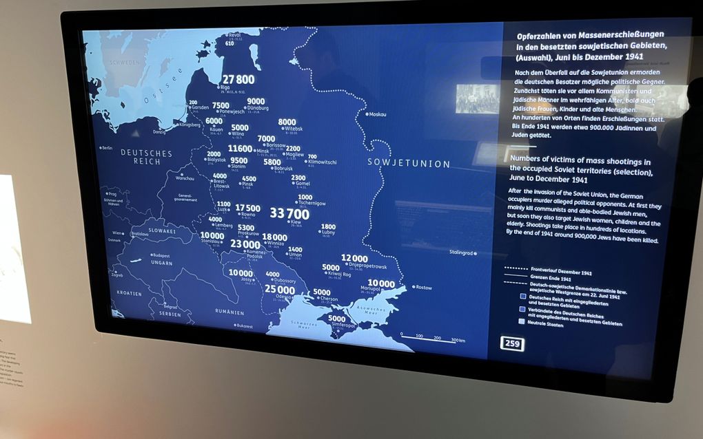 Een Duitse schoolklas krijgt luidkeels uitleg over de gruwelen van toen. Panelen bieden informatie over de massamoord die de nazi’s uitdachten en uitvoerden, in blinde haat en ijver. Op een kaart van Europa staat aangegeven waar massa-executies plaatshadden en hoeveel Joden daarbij werden omgebracht. De grootste aantallen –huiveringwekkend groot– zijn het grootst weergegeven: 33.700, 27.800, 25.000, 23.000. Het zijn afgeronde aantallen, maar elk mens was er één.