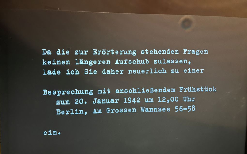 Binnen klinkt het geluid van een typemachine. Letter voor letter verschijnt de uitnodiging voor de conferentie op het scherm: „Omdat de te bespreken onderwerpen geen langer uitstel toelaten, nodig ik u nogmaals uit voor een bijeenkomst met aansluitend ontbijt op 20 januari 1942 om 12.00 uur in Berlijn, Am Grossen Wannsee 56-58.”
