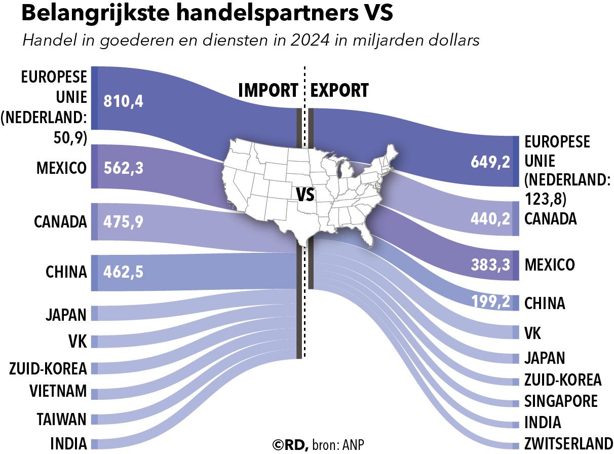 Sommige van die details staan al vast. Amerikaanse benzineauto’s, bijvoorbeeld, zullen in aanschafprijs goedkoper worden in Europa, want daarvoor geldt geen importheffing. Dat geldt ook voor diervoeding en noten. Halfgeleiders die ASML produceert komen in de VS in een soortgelijk nultarief. Op farmaceutische producten daarentegen, die nu aan beide kanten niet worden belast, komt voorlopig de algemene heffing van 15 procent. Die zal grofweg gaan gelden voor 70 procent van alle producten die worden verhandeld.