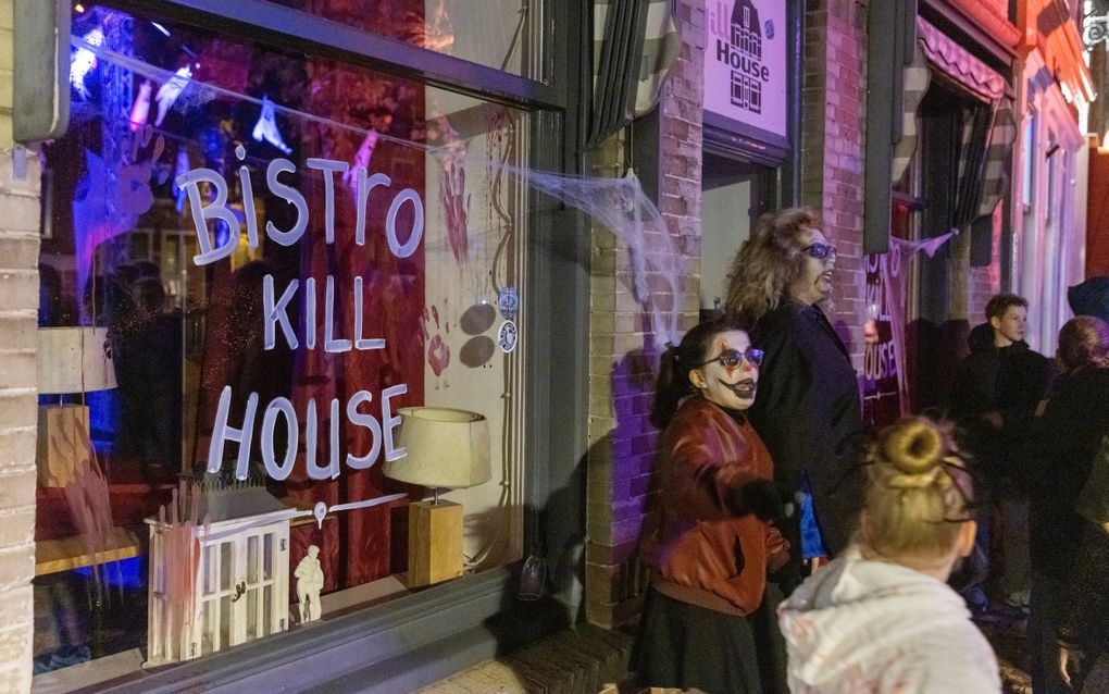 Zo’n 100 meter verder, aan de andere kant van de Marktstraat, klinken heel andere geluiden. Angstaanjagend gelach is te horen tijdens een voorstelling van tientallen ‘heksen’, een kettingzaag brult en een man die zogenaamd naar het schandblok wordt getrokken, jammert het uit. Het is de Nacht van het Griezelen in het centrum van het historische stadje. Overal lopen mensen rond met bebloede gezichten, enge maskers of donkere gewaden. Aan een brug bungelen twee levensgrote skeletten. Een café is deze avond hernoemd in Bistro Kill House, wat zoiets als moordhuis betekent.