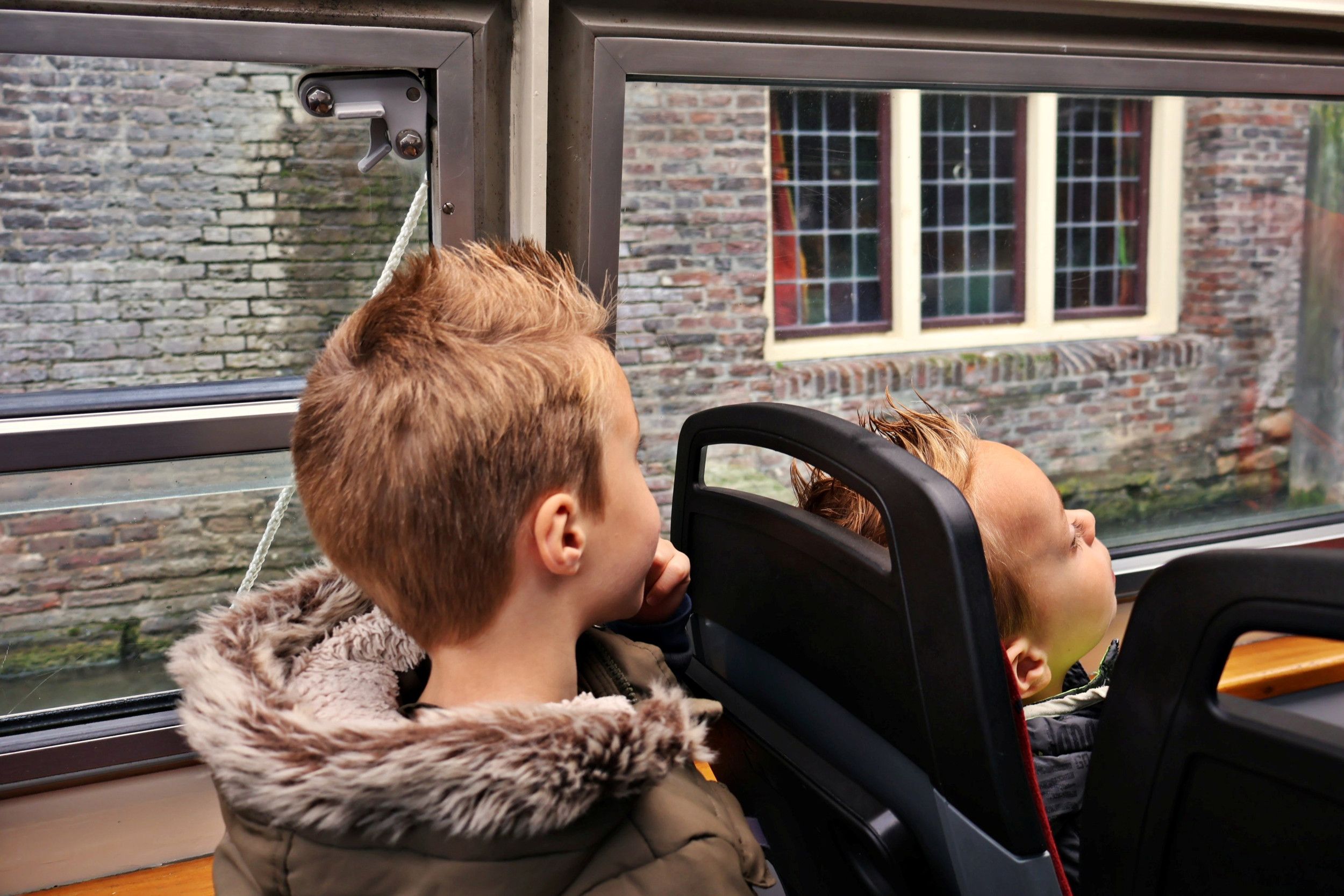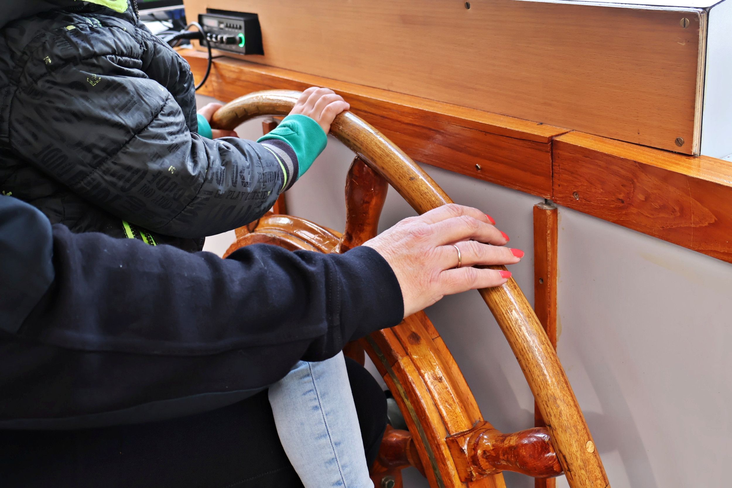 Joas en Micha hebben inmiddels hun stoeltjes verlaten, en drentelen rond het bestuurdersdeel van de boot. „Wil je op schoot?”, vraagt Carla aan Micha. „Dan mag je even sturen.” Micha wil wel, en zo stuurt een vierjarige ons door de gracht. Langs de 19de-eeuwse Zeven Steegjes, een voormalig volksbuurtje, gebouwd door een rooms-katholieke armenzorg voor kinderrijke parochianen. „Iets naar rechts”, instrueert Carla. „Gaat het goed, kapitein?” Na Micha mag Joas, maar die kruipt liever niet zomaar bij een vreemde op schoot. „Ik wil gewoon stáán achter het stuur.” Dat kan wel, maar enkel zijn kuif steekt dan boven het instrumentenpaneel uit.
