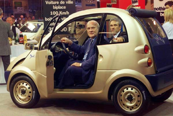 Guy Ligier, voormalig directeur van Ligier, poseert met zijn zoon Philippe, die momenteel directeur is, in een Due.