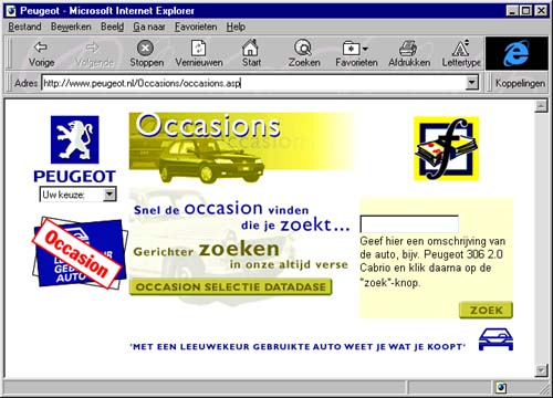 Met 3500 auto's is Peugeot Nederland, zo stelt de importeur, de grootste aanbieder van occasions via Internet. De verwachting is in de loop van dit jaar uit te komen op 7000 à 8000 auto's. Het adres van de site is www.peugeot.nl.