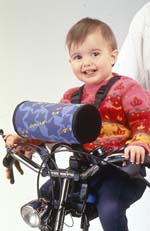 GMG-voorzitjes zijn geschikt voor kinderen tot en met drie jaar. De kleine zit in een gordel en kan zich vasthouden aan een speelstuurtje. Dat stuurtje is soms ook een handicap. Als de peuter begint te knikkebollen, dreigt het hoofd tegen het stuur te stoten. Ouders proberen dat al fietsend te voorkomen door met één hand hun kind rechtop te houden. Dat kan onveilige situaties in het verkeer veroorzaken. Een knikkebolrol is de oplossing voor dit probleem. De schuimrubberrol zit in een waterdichte hoes. Hij wordt over het speelstuurtje geklemd en met een klittenbandsluiting vastgezet. De slaaprol is bij Halfords voor 24,95 gulden verkrijgbaar in verschillende dessins. | |