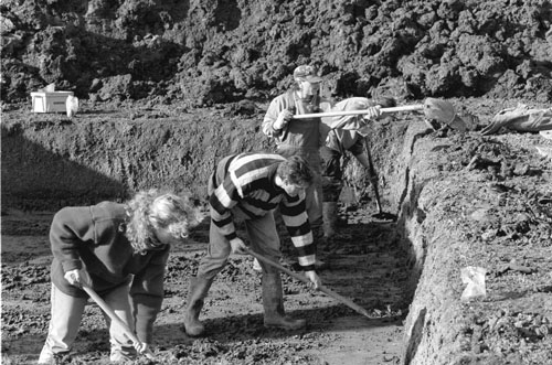Waar de grond laagje voor laagje wordt weggeschept, tekent zich de plattegrond van een boerderij uit de bronstijd af.