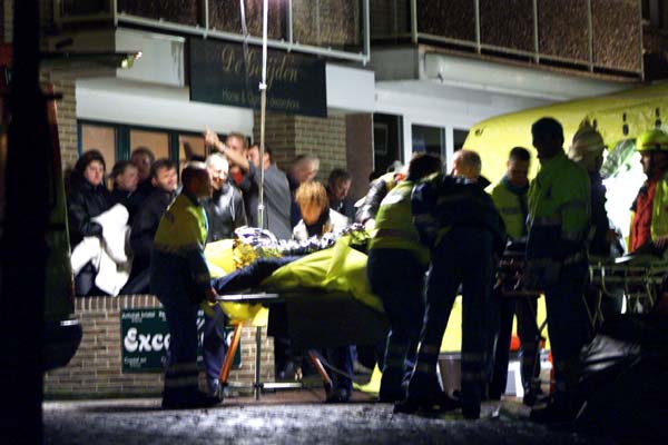 VOLENDAM Een van de slachtoffers van de brand in Volendam wordt op een brancard afgevoerd.