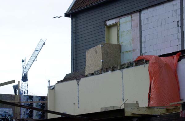 | VOLENDAM Wel een nooduitgang, geen trap. Die ontbreekt vanwege de bouw van appartementen naast Het Hemeltje. Het ontbreken van voldoende vluchtvoorzieningen bij dergelijke cafés is enkele jaren geleden in een rapport reeds aan de kaak gesteld.