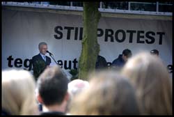 Dr. ir. J. van der Graaf riep tijdens het stil protest op niet boos of moedeloos te worden door het aannemen van de euthanasiewet door de Eerste Kamer. De kaarten lijken geschud, maar wij weten dat de besluiten over leven elders vallen. Wij protesteren voor het leven en voor de Schepper van het leven. We moeten geen straatvechters, maar straatbidders zijn voor een arm volk. Laten we niet ontmoedigd hier vandaan gaan, want Christus leeft tot in eeuwigheid, aldus de voormalige algemeen secretaris van de Gereformeerde Bond.Rabbijn mr. drs. R. Evers zag in de grote belangstelling van jongeren voor het stil protest de mogelijkheid om tot oprichting van een nieuwe, brede stroming in onze samenleving te komen, die zich kan verzetten tegen onbijbelse ontwikkelingen. De Drachter predikant ds. O. Bottenbleij riep de duizenden aanwezige jongeren ertoe op juist in deze tijd bewust te kiezen voor een beroep in de medische zorg. Zodat mensen aan het bed ook de liefde van Christus zullen ervaren. Het stil protest is volgens de predikant een geweldige oproep aan de kerk van Nederland om weer te staan voor de normen en waarden van God, temeer nu blijkt dat een overgrote meerderheid van het volk voor de euthanasiewet heeft gekozen. Binnenhof