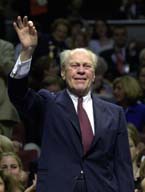 Ford kreeg gisteren een enthousiast onthaal tijdens de Republikeinse conventie die in Philadelphia plaatsvindt. Maar later op de dag klaagde hij over pijn. In het Hahnemann-ziekenhuis werd hij daarop behandeld voor een zware bronchitis. Hij werd ontslagen, maar keerde later terug met evenwichtsproblemen en hij sprak moeilijk. Men constateerde daarop dat er geen sprake was van bronchitis, maar dat Ford één of misschien zelfs twee kleine beroerten had gehad.Dokter Thomas voorspelde een volledig herstel voor de oud-president. Fords plotselinge opname wierp een lichte schaduw over de Republikeinse conventie. Ik wens de president een spoedig herstel toe, aldus Dick Cheney die gisteren officieel werd gekozen tot vice-presidentskandidaat. Cheney was chef-staf van het Witte Huis onder president Ford. Presidentskandidaat Bush telefoneerde met echtgenote Betty Ford. Zij was erg nerveus, maar zij hoopt dat de president volledig zal herstellen, aldus Bush. | |