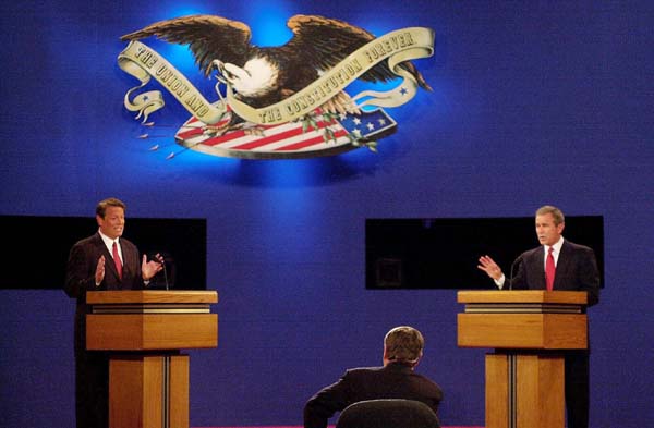 BOSTON De Republikeinse presidentskandidaat George W. Bush en zijn Democratische rivaal Al Gore (r) tijdens hun eerste debat, gisteren in Boston.