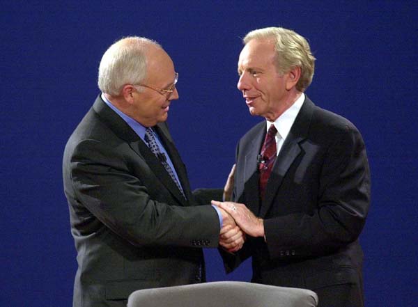 NEW YORK De Republikeinse vice-presidentskandidaat, Cheney (l.), en zijn Democratische rivaal, Lieberman, schudden elkaar de hand alvorens in debat te gaan.