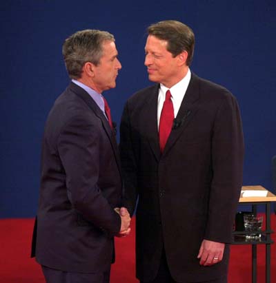 ST.-LOUIS Bush (l.) en Gore schudden elkaar de hand. Gisteravond hielden de Amerikaanse presidentskandidaten hun derde en laatste televisiedebat.