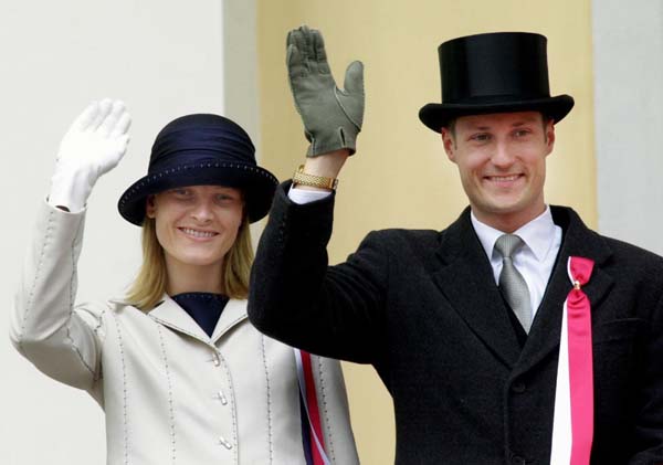 | OSLO De Noorse prins Haakon en zijn verloofde Mette Marit Tjessem Hoeiby op het koninklijk balkon tijdens de Noorse Dag van de Grondwet. Het was voor het eerst dat Haakons verloofde verscheen in de hoedanigheid als toekomstige bruid van de kroonprins.