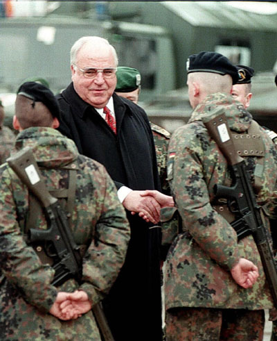 SARAJEVO Helmuth Kohl schudt soldaten de hand op de basis Rajlovac bij Sarajevo. De Duitse bondskanselier bracht gisteren een kort bezoek aan de Duitse SFOR-troepen in Bosnië.