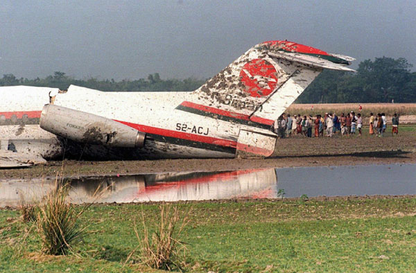 | SYLHET Een dag nadat het toestel neerstortte bij de plaats Sylhet in het noordoosten van Bangladesh bekijken omwonenden de gebroken staart van de Fokker 28 Biman Bangladesh Airlines. Als door een wonder kwamen de 89 inzittenden er met lichte verwondingen vanaf. De meeste passagiers waren uit Londen terugkerende Bengalezen.