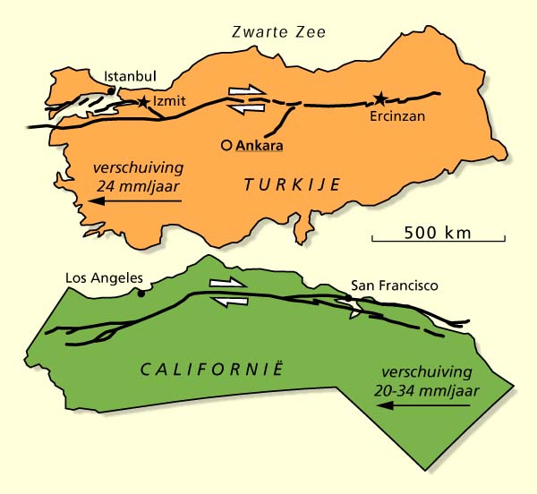| ISTANBUL Een groep Amerikaanse wetenschappers heeft de aardbeving in Turkije onderzocht. Hun interesse komt voort uit de grote overeenkomst die de breuklijn in Noord-Turkije heeft met de San-Andreasbreuk langs de westkust van Californië. Illustratie RD, bron USGS |
