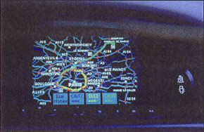 | Renault heeft de Visionaute ingebouwd in de Megane Scenic, waarop de file-informatie direct te zien is. Rechts van de kilometerteller zit het schermpje met de plattegrond van Parijs. Wie het scherm te klein vindt, kan kiezen voor een concurrent, de Skipper, die in de zonneklep is weggewerkt. Dat apparaat kan echter geen alternatieve routes berekenen.