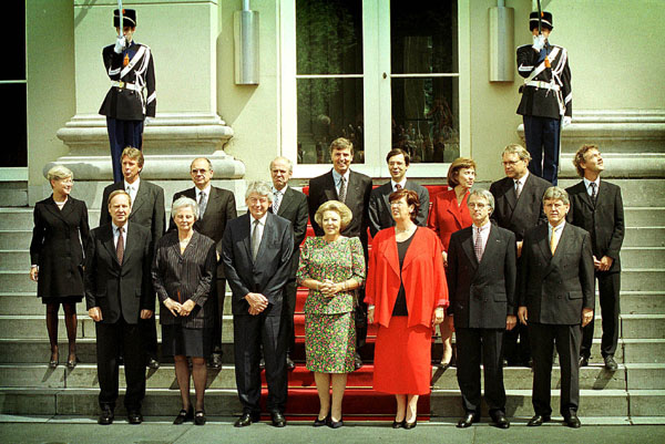 | DEN HAAG De ministers van het tweede paarse kabinet met koningin Beatrix op het bordes van Paleis Noordeinde. Allerlei voorstellen van ethische aard die in het regeerakkoord staan genoteerd, komen opeens als wetsvoorstellen naar buiten. RD, H. J. Visscher |