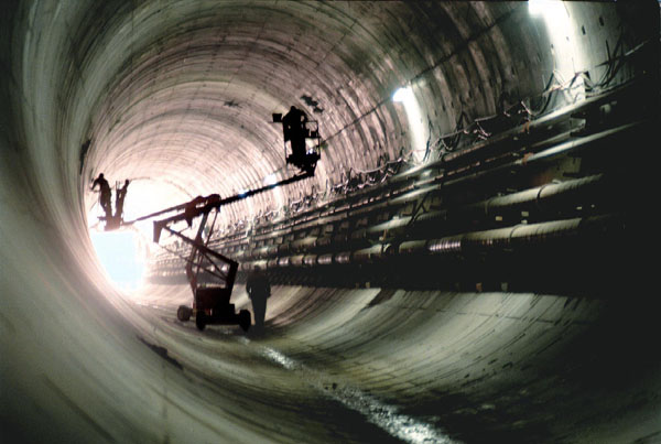 | BARENDRECHT Enkele meters diep onder de Oude Maas bij Barendrecht werken bouwvakkers in hoogwerkers aan de afwerking van de eerste tunnelbuis van de Tweede Heinenoordtunnel. Als de lange tunnelboormachine binnenkort wordt gedemonteerd, zal ook de afwerking van de tweede tunnelbuis beginnen. Deze eerste geboorde landbouw- en fietstunnel kost ruim een kwartmiljard gulden en geldt als proefproject voor de bouw van de hsl- en Betuwelijn.