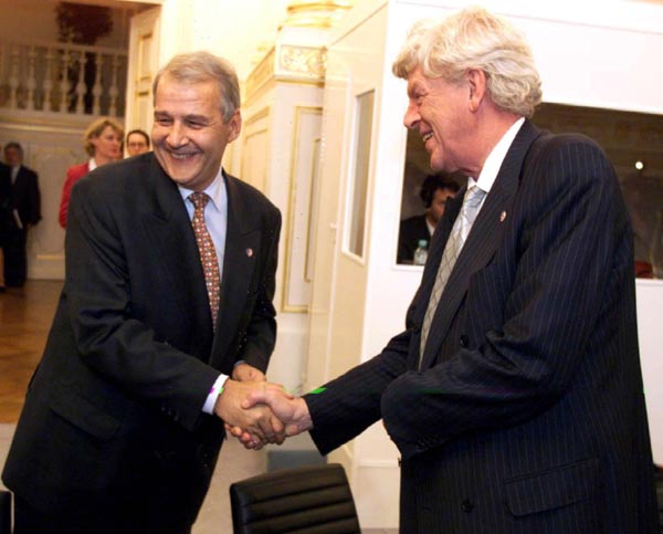 | WENEN De voorzitter van de Raad van Europese ministers van economie en financiën, de Oostenrijker Rudolf Edklinger (l), verwelkomde gisteren de president van de Europese Centrale Bank, Duisenberg, bij het begin van de middagzitting van de raad in Wenen.