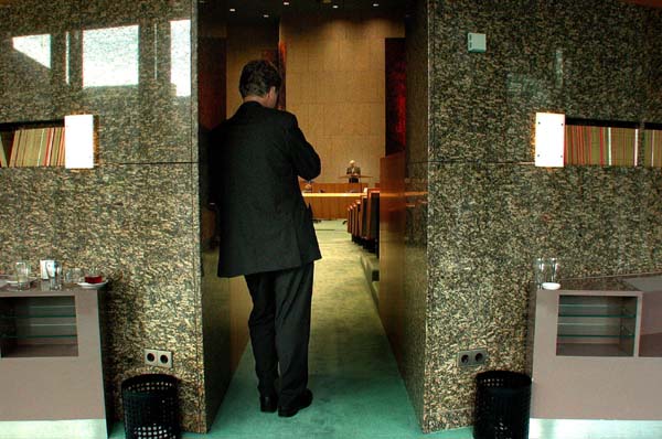 | Trots is Dittrich als hij de laatste restjes christendom opruimt, zoals hij keer op keer en triomfantelijk uitbazuint. Foto: Het D66-kamerlid Dittrich luisterend naar collega Schutte van de ChristenUnie tijdens het debat over het homohuwelijk.