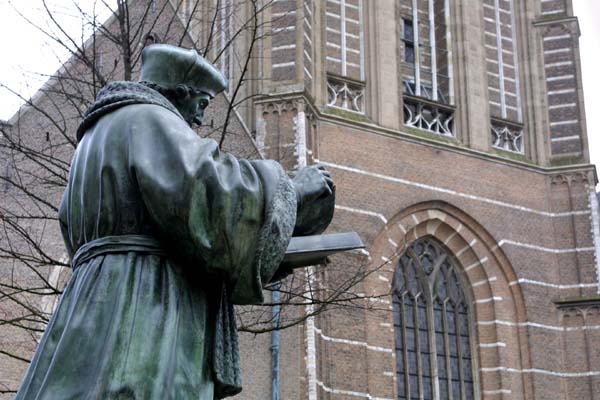 Bij nader inzien en toezien blijkt die fijnbesneden humanist daar vlak voor de op zondag vrijwel lege Laurenskerk in Rotterdam dan toch maar van klinkend metaal te zijn en daarmee aan het eind van zijn Latijn.