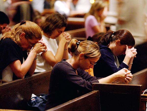 | Het gebeuren in Amerika is voor Amerika zelf, en trouwens voor de hele westerse samenleving, een oproep tot verootmoediging, een oproep om eerst het koninkrijk van God te zoeken. Foto: biddende Amerikanen in de St. Patrick's Cathedral, New York, een dag na de aanslagen.