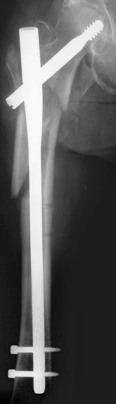 De Gamma-nagel zoals zij is bevestigd in het bovenbeen.