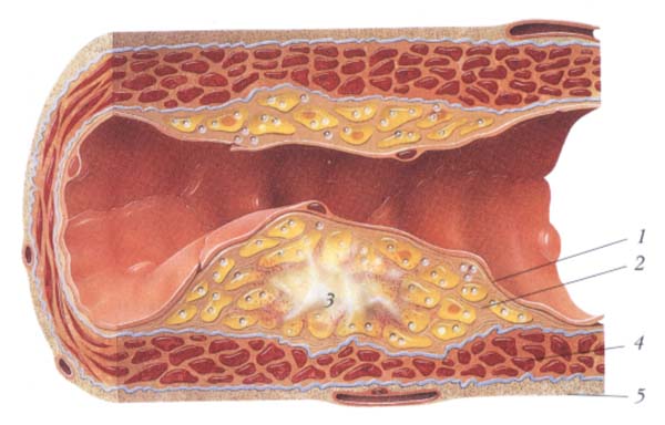 Doorsnede van een bloedvat. Onder de binnenbekleding van de vaatwand bevindt zich een grote hoeveelheid cholesterol, vet en dode witte bloedcellen waardoor het bloedvat ernstig is vernauwd.