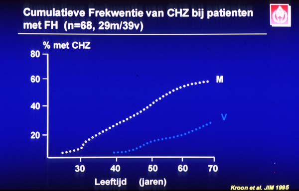 | Het voorkomen van kransslagadervernauwingen en hartinfarcten onder mannen en vrouwen met familiaire hypercholesterolemie. Het percentage mensen met hart- en kransslagaderlijden stijgt naar gelang de leeftijd toeneemt.
