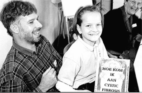 Vader Han Broeksma uit Waddinxveen met op schoot dochter Liesbeth (8). Zij heeft de taaislijmziekte. Op de achtergrond rechtsboven haar moeder Harma.