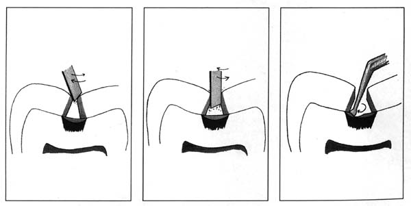 | Met behulp van een glazuurmesje kan de tandarts de kleine opening van een gaatje groter maken (linkerplaatje), totdat de opening zo groot is dat een tandbeenlepeltje erdoor kan (midden). Met het tandbeenlepeltje kan hij vervolgens de zachte inhoud plus het al het aangetaste brosse tandweefsel uit het gaatje verwijderen (rechts). Illustratie afkomstig uit: Atraumatic Restorative Treatment for Dental Caries (ISBN 90 6759 024 X); STI Book, Postbus 1191, 6501 BD Nijmegen. |