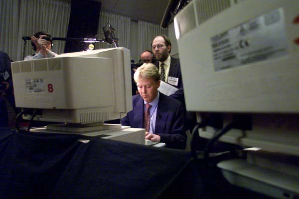 | DEN HAAG Prins Willem-Alexander bedient de computer in het Haagse Congrescentrum. Tijdens het tweede Wereld Water Forum, welke door de kroonprins werd voorgezeten, chatte hij via internet met jongeren uit de hele wereld. Vanaf UNICEF-kantoren in onder meer India, Vietnam en Malawi wisselden jongeren van gedachten met de kroonprins over het belang van water en sanitaire voorzieningen.
