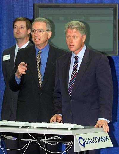 ![]() | WHITEVILLE President Bill Clinton (r.) en de directeur van Remote Data Systems Bill Fink (l.) kijken naar een internetpresentatie tijdens een bezoek van Clinton aan het bedrijf in Whiteville. De president van de VS laat zich informeren over het belang van internet voor verafgelegen landbouwgebieden.