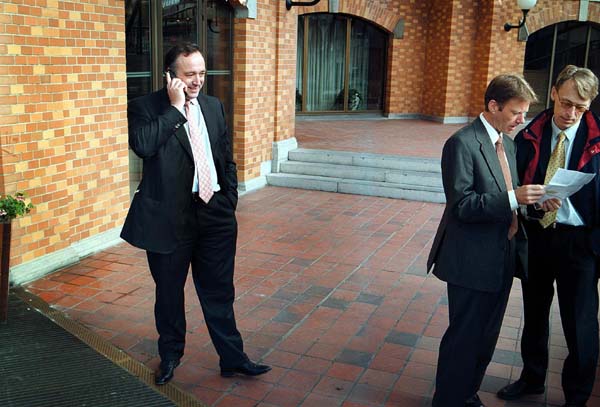 | SCHEVENINGEN De topman van Dutchtone, Paul Renault, belt nog even snel voor aanvang van de veiling in het Kurhaus in Scheveningen. Vanaf vandaag worden er vijf frequenties voor de nieuwe generatie mobiele telefonie UMTS geveild. Onder zeer strenge veiligheidsmaatregelen hebben de gegadigden voor deze frequenties zich opgesloten in het Kurhaus. Verwacht wordt dat het spel van loven en bieden, waarmee miljarden guldens zijn gemoeid, enkele dagen tot enkele weken zal duren.