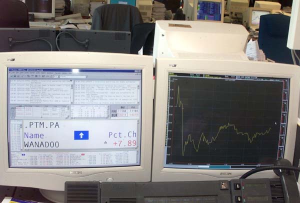 | PARIJS Twee computers tonen de prijs van de aandelen van de Franse internetprovider Wanadoo. De aandelen zijn gisteren na de introductie op de Parijse effectenbeurs flink in waarde gestegen. In de eerste uren van de handel fluctueerde de koers sterk. Uiteindelijk stabiliseerde die tussen de 20 en 21 euro. Vroeg in de middag stond de internetdochter van France Télécom op 20,30 euro, 7 procent hoger dan de uitgiftekoers van 19 euro.
