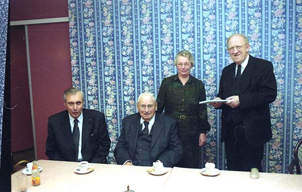 | NIJKERK Ds. J. H. C. Olie, voorzitter van de Stichting LV-Fonds, presenteerde gisteren in De Schakel te Nijkerk het boek 't Goed dat nimmermeer vergaat. De stichting bestaat dezer dagen tien jaar en stelt zich ten doel werken van wijlen ds. L. Vroegindeweij uit te geven zonder commerciële doelstelling. De voorzitter overhandigde de eerste bundel van 't Goed dat nimmermeer vergaat aan mevr. J. de Knegt-Vroegindeweij uit Barneveld, dochter van de auteur. De bundel bevat elf preken. Geheel links een neef van ds. L. Vroegindeweij, ds. J. Vroegindeweij, emeritus predikant te Bilthoven, en ds. W. Vroegindeweij, emeritus predikant te Voorthuizen, broer van de auteur.
