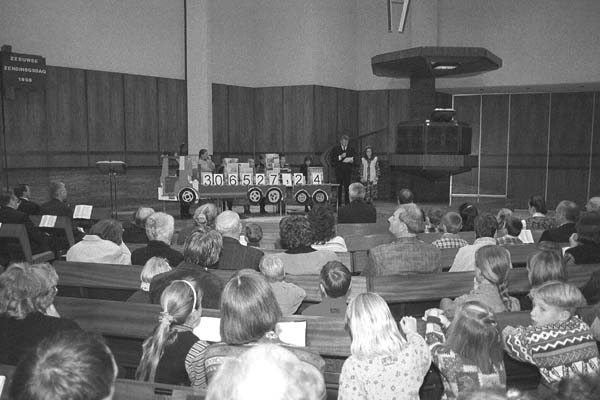 | GOES De zendingscommissies van de Gereformeerde Gemeenten in Zeeland overhandigden zaterdag op de Zeeuwse Zendingsdag 306.527,24 gulden aan het zendingsbureau. Op symbolische wijze boden kinderen uit Kapelle dit bedrag aan ds. J. J. van Eckeveld aan. Dit is de kroon op dit grote project, zei hij.