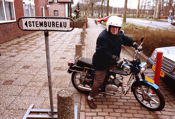 | WOUWSE PLANTAGE In Wouwse Plantage (gemeente Roosendaal) werd voor de gemeenteraad via de stemmachine gestemd en voor de Provinciale Staten gewoon op de ouderwets manier, met het potlood. Over heel Nederland viel de opkomst bij de Statenverkiezingen tegen, maar sommige mensen hadden er wel een ritje op de brommer voor over om hun stem uit te brengen.