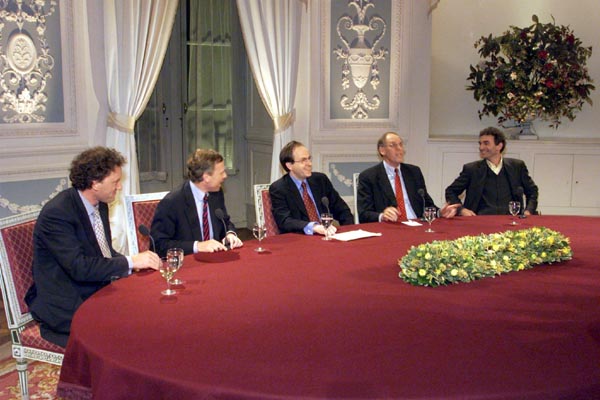 | HAARLEM De Provinciale Statenverkiezingen werden gisteravond afgesloten met een debat tussen de fractievoorzitters. Achter de tafel zitten van links naar rechts De Graaf (D66), De Hoop Scheffer (CDA), Melkert (PvdA), Dijkstal (VVD) en Rosenmöller (GroenLinks).