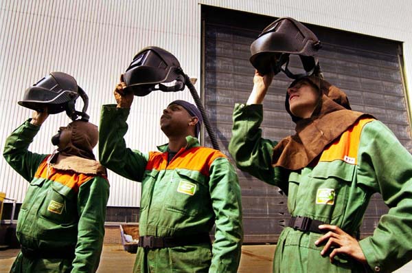 SCHIEDAM Lassers van het Schiedamse staalconstructiebedrijf HSM kijken in de pauze door hun lasbrillen naar de zon als voorbereiding op de eclips van woensdag 11 augustus.