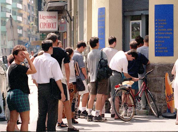 Hongaren in Boedapest staan in de rij om een eclipsbrilletje te bemachtigen. De zone van de zonsverduistering beslaat een aanzienlijk deel van Hongarije.