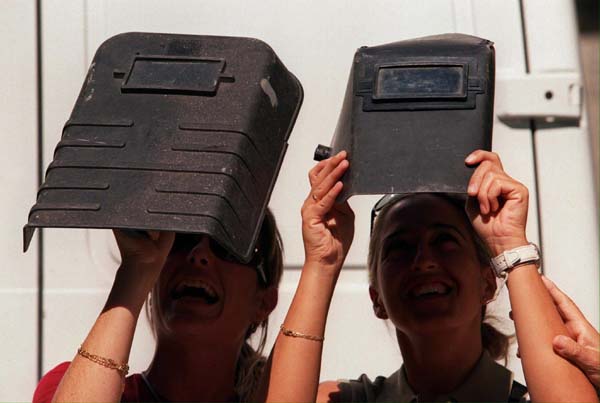 Twee vrouwen in Madrid gebruiken maskers van lassers om hun ogen mee te beschermen.