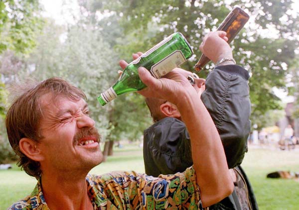In Praag proberen twee daklozen de zon te bekijken door een lege fles.