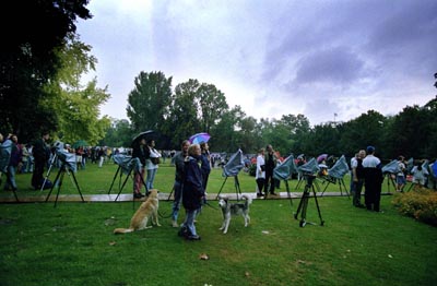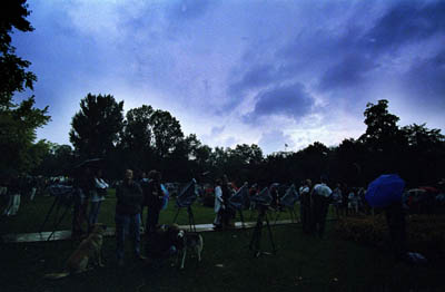 | STUTTGART Donker, donkerder, donkerst. Toeschouwers van de totale eclips in de Zuid-Duitse Sonnenhauptstadt Stuttgart kijken omhoog naar een bewolkte hemel. Een blik op de zon is ze niet vergund, maar dat staat de ervaring van twee minuten duisternis niet in de weg. Als om 12.33.55 uur ineens het donker invalt, is het in vijf seconden nacht, zoals bij volle maan.