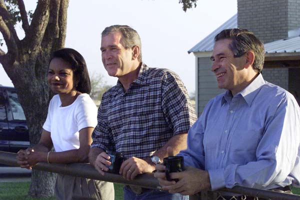 | CRAWFORD Gouverneur van Texas en presidentskandidaat George W. Bush, op zijn ranch met adviseurs op het vlak van buitenlands beleid Condoleezza Rice (l.) en Paul Wolfowitz. De opiniepeilingen wijzen sinds kort op een verschuiving van de kiezersgunst richting zijn Democratische rivaal Al Gore.